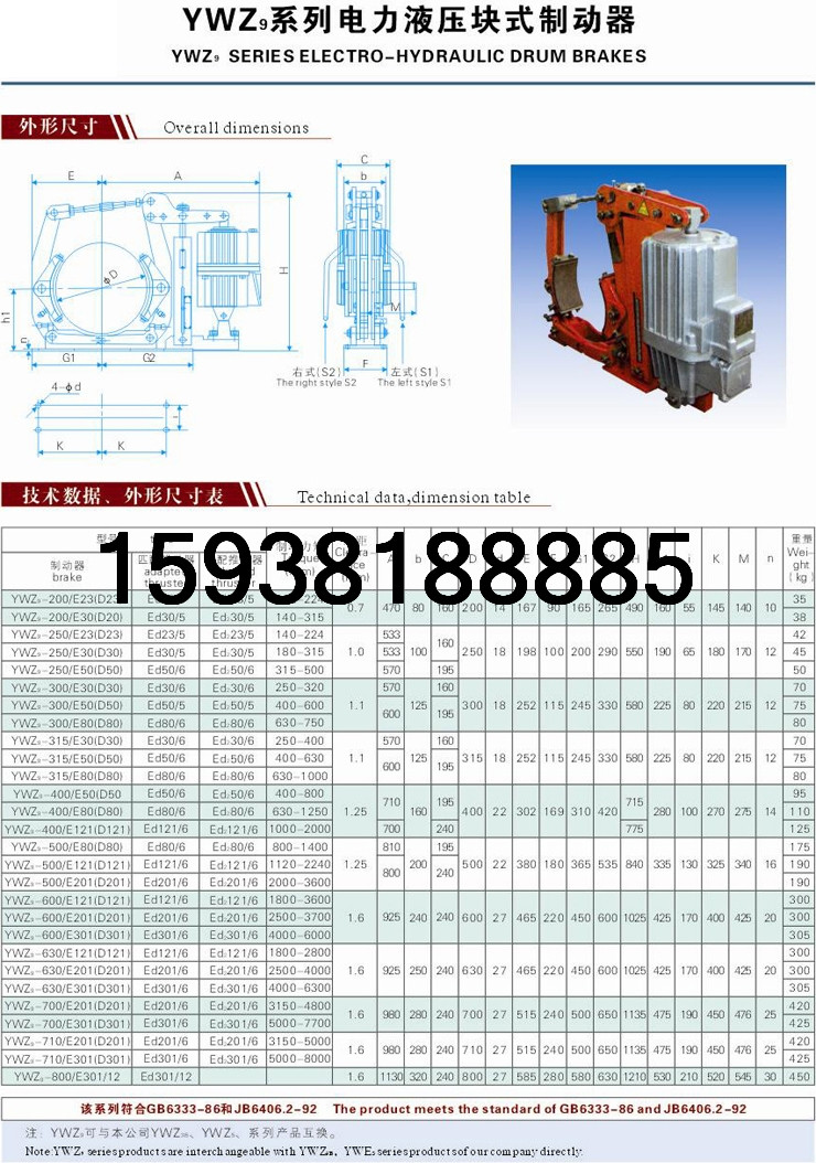 YWZ9電力液壓塊式制動(dòng)器型號(hào):YWZ9-200/23;YWZ9-200/30;YWZ9-250/23;YWZ9-250/30;YWZ9-250/50;YWZ9-300/30;YWZ9-300/50;YWZ9-300/80;YWZ9-315/30;YWZ9-315/50;YWZ9-315/80;YWZ9-400/50;YWZ9-400/80;YWZ9-400/121;YWZ9-500/80;YWZ9-500/121;YWZ9-500/201;YWZ9-600/121;YWZ9-600/201;YWZ9-600/301;YWZ9-630/121;YWZ9-630/201;YWZ9-630/301;YWZ9-700/201;YWZ9-700/301;YWZ9-710/201;YWZ9-710/301;YWZ9-800/301/12