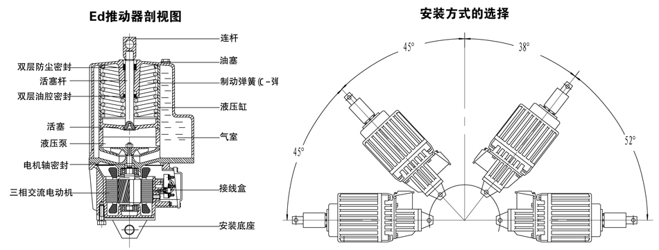 所有推動(dòng)器的推桿連結(jié)塊都可以旋轉(zhuǎn)。Ed50-Ed301 安裝底座可作90。旋轉(zhuǎn)。Ed23和Ed30安裝底座也可提供900旋轉(zhuǎn),但安裝高度尺寸A增加8毫米(訂貨時(shí)說(shuō)明) 。 無(wú)論何種安裝位置,活塞桿都不能承受徑向力,以免影晌使用效果和壽命。