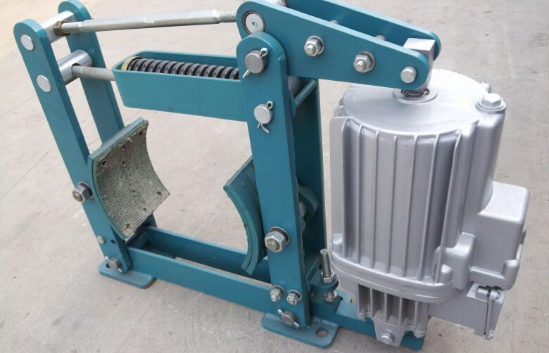 在接通電源時,電磁松閘器的鐵心吸引銜鐵壓向推桿,推桿推動左制動臂向左擺,主彈簧被壓縮。同時,解除壓力的輔助彈簧將右制動臂向右推,兩制動臂帶動制動瓦塊與制動輪分離,機構(gòu)可以運動。當(dāng)切斷電源時,鐵心失去磁性,對銜鐵的吸引力消除,因而解除銜鐵對推桿的壓力,在主彈簧張力的作用下,兩制動臂一起向內(nèi)收擺,帶動制動瓦塊抱緊制動輪產(chǎn)生制動力矩;同時,輔助彈簧被壓縮。制動力矩由主彈簧力決定,輔助彈簧保證松間間隙。塊式制動器的制動性能在很大程度上是由松閘器的性能決定的。
