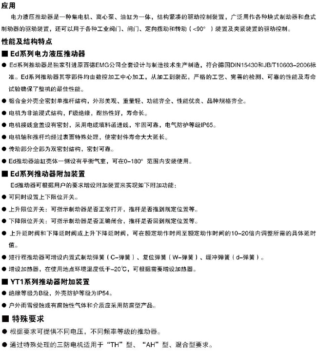 ED系列電力液壓推動器:ED-23/5;ED-30/5;ED-50/6;ED-80/6;ED-121/6;ED-201/6;ED-301/6;ED-50/12;ED-80/12;ED-121/12;ED-201/12;ED-301/12;ED-630/12 BED ZED系列電力液壓推動器:BED30/5;B ......